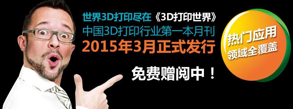 2月9日,珠海再生时代宣布,将于2015年3月起发售中国3D打印行业第一本月刊,该月刊已确定命名为《3D打印世界》,预定每月一期,限量发售2万本。内容覆盖医疗、模具、汽车等各个应用领域。届时,也将同步发售电子版,并将于各大互联网媒体合作。