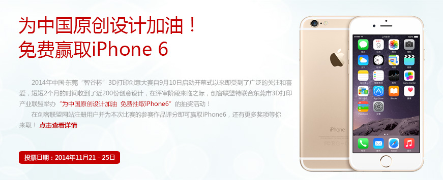 2014年中国•东莞“智谷杯”3D打印创意大赛自9月10日启动开幕式以来就受到了广泛的关注和喜爱,短短2个月的时间收到了近200份创意设计,在评审阶段来临之际,创客联盟特联合东莞市3D打印产业联盟举办“为中国原创设计加油 免费抽取iPhone6”的抽奖活动!