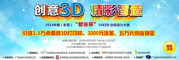“创意3D·精彩智造”2014中国(东莞)“智谷杯”3D打印创意设计大赛是由东莞3D打印技术产业联盟、南方报业传媒主办,以东莞市经济和信息化局、东莞市科学技术局为指导单位的设计比赛,自9月10日举办大赛的启动仪式、正式开始收集设计作品以来,截至今天(11月14日),大赛共收到59份3D打印创意设计作品,社会反响十分踊跃,引起全城“3D设计热”。据悉,设计作品收集活动截止时间为11月20日,广大好“设”之徒还不赶快登录: www.makerlm.com 加入我们的设计大军?