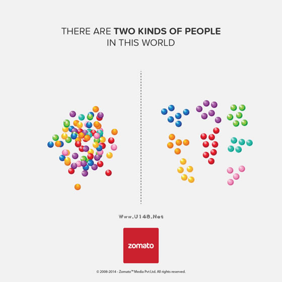 小编平时说世上的人千差万别,针对不同的事物又有不同的喜好。但是Zomato公司分析了人们在食物、就餐行为上的偏好,却发现了一个令人惊讶的事实:世界上只有两种人!随后他们把这一结果用一张张插画海报对比呈现了出来。小伙伴们快来对号入座吧。