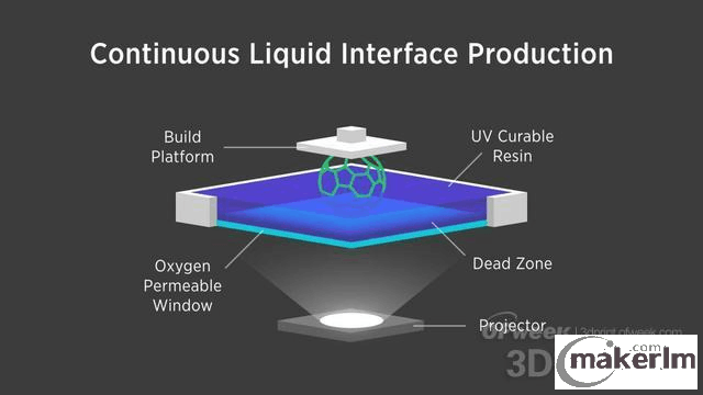 现有的3D打印工艺使用液态树脂,在一个缓慢的过程中逐层打制作出物品:先打印一层,固化它,补充树脂材料,然后再打印一层,周而复始,直到打印完成。而在CLIP工艺中,一个投影机从下方用紫外线显示连续的、极薄的物品横截面。紫外线在一缸液态树脂中以横截面方式硬化液体。与此同时,一台升降机不断将成形的物体捞出树脂缸。
