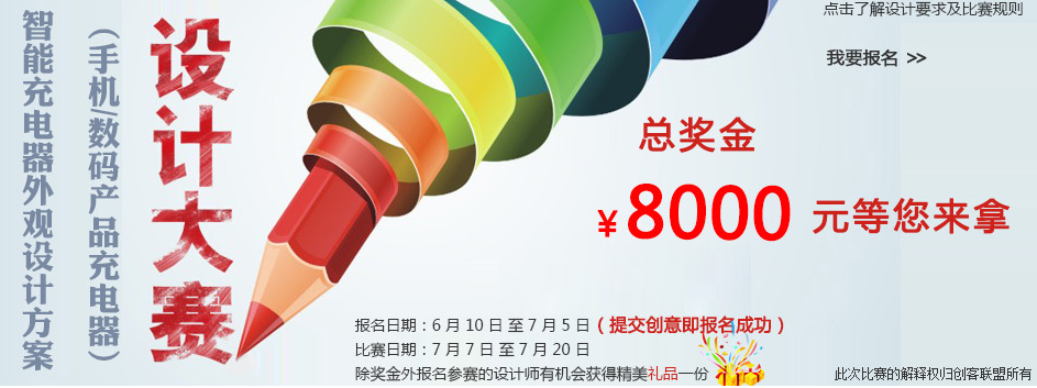 文章概述:来创客联盟做中国好设计,本次大赛主要围绕智能充电器外观的设计和手机、数码等产品为主,除此之外,8000元现金大奖和精美礼品也成为了此次大赛的亮点。