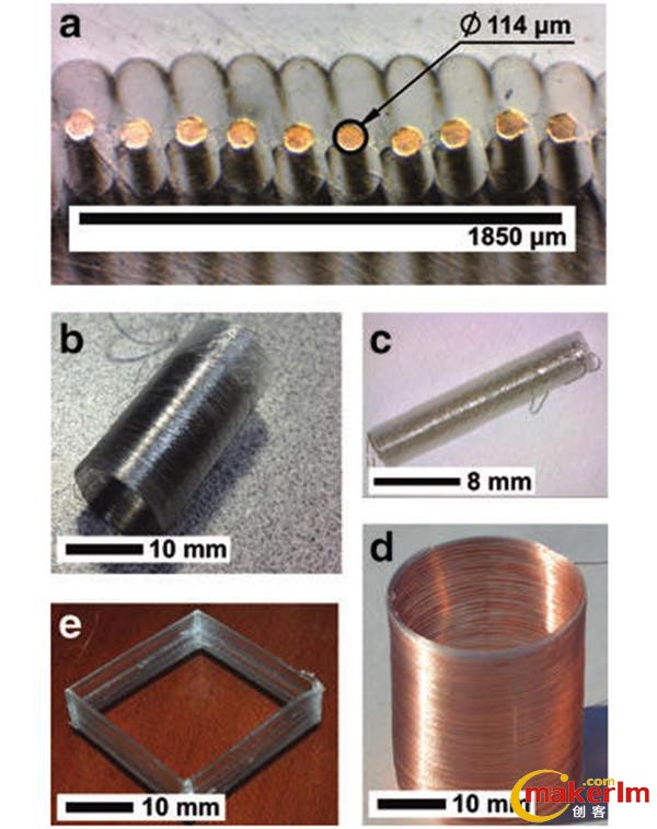 如图所示,该结构使用FEAM工艺打印,图A是外径25.4毫米螺旋线的剖面特写显微镜照片;图B、图C分别是13毫米、4毫米外径的镊丝螺旋线圈;图D为25毫米外径铜丝螺旋线圈;图E是26毫米宽、角线半径600微米的方形线圈。