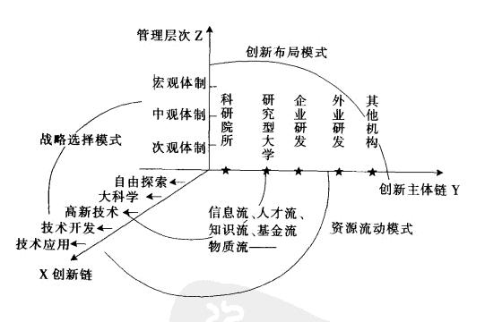 如以创建链、创新主体链、管理层次链作类似于生产力、生产关系与上层建筑制约关系的三维关系图示如下。对其三维坐标之间的关系,可以概括为: