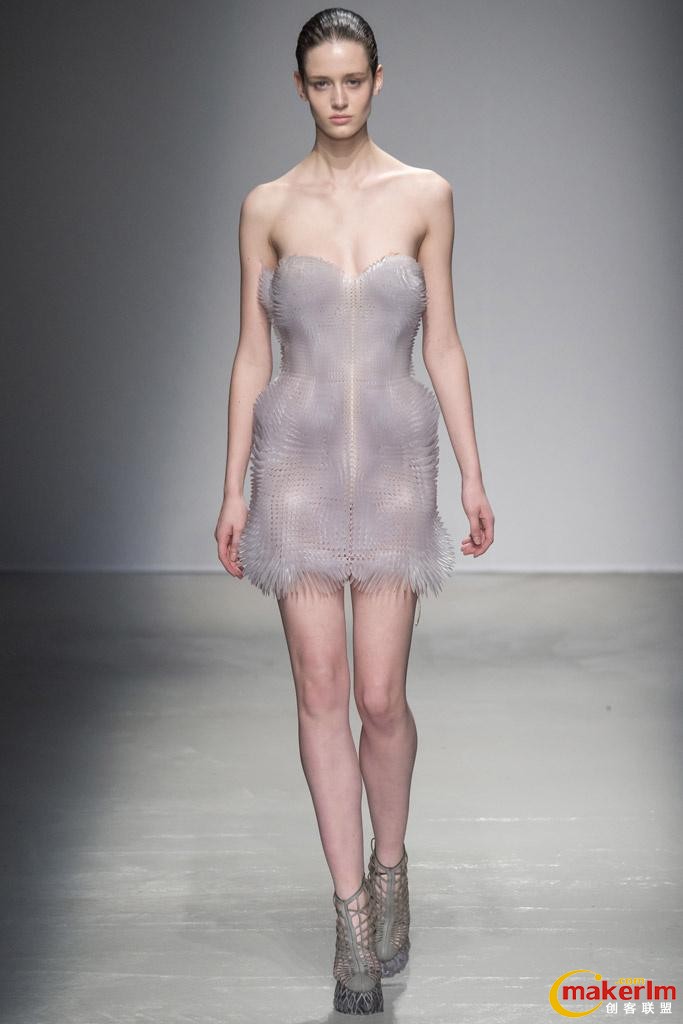 这款衣服还是高度定制,模特在穿上这件衣服之前,首先经过3D扫描,再经过长时间酝酿、设计和多次修改之后,由3D Systems公司使用ProX950 3D打印机完成最后打印工作。这件礼服由4部分组成,打印时间比打印一台车子的时间还长,总计花了200小时,再经过几小时手工整理和后处理,这件完美的礼服最终得以完成。