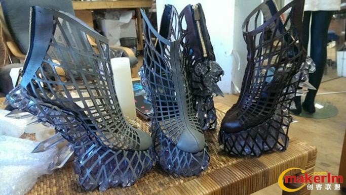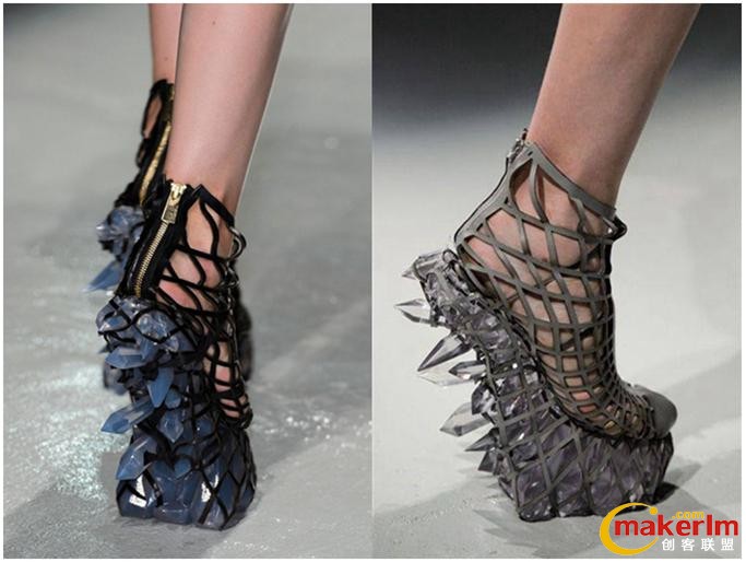 除了这款礼服,荷本还和著名鞋类设计师Noritaka Tatehana一起制作了一对充满个性的水晶风格3D打印鞋,两名设计师使用3D打印技术和激光切割技术完成了这一项目。